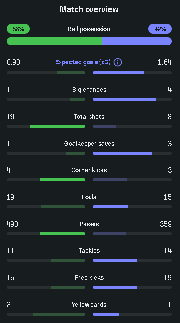 From that point, the game follows a predictable pattern. Bologna with the ball, Villa comfortable without it. But there is a clear issue: Bologna do not create. They have possession and volume, but lack quality in the final third.